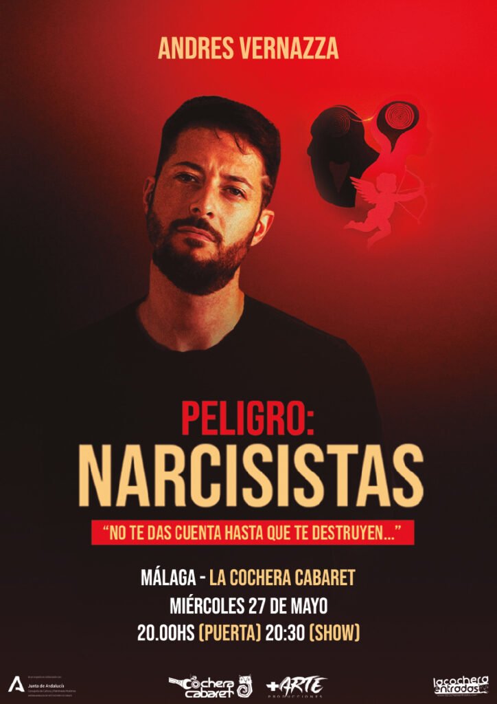 «Peligro: Narcisistas” es un espectáculo híbrido entre teatro y psicología, donde Andrés Vernazza interpreta a un narcisista y, junto al público, recrea las siete etapas del vínculo traumático: desde el bombardeo de amor hasta el control emocional.