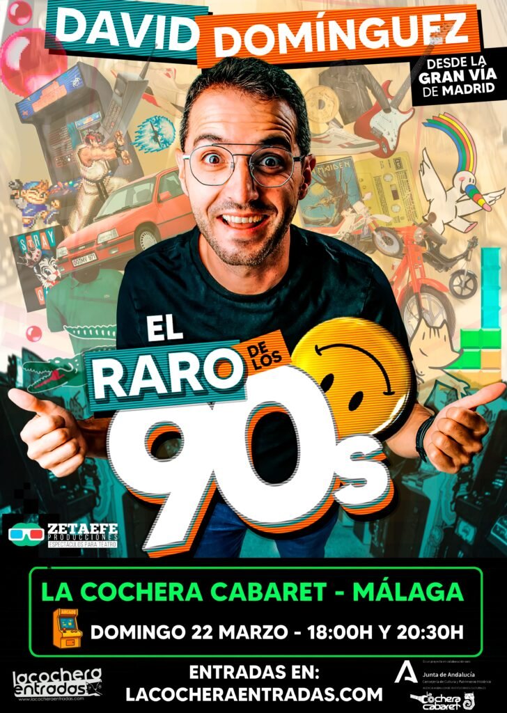 «El RARO de los 90» es un espectáculo de humor en el que David Domínguez da un repaso en tono irónico, simpático y gamberro a sus vivencias en la maravillosa década de los 90. Con ese don que lo caracteriza para hacer reír cuenta situaciones irónicas y divertidas.